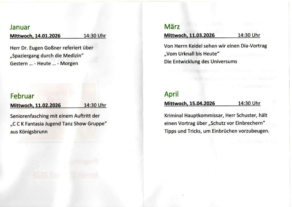 Das Team organisiert und hält einmal im Monat an einem Mittwoch den Seniorennachmittag ab 14:30 Uhr im Pfarrsaal St. Georg ab. Die Bandbreite der angebotenen Themen reicht von Religion, Gesundheit, Reisen, bis Sicherheit und Freizeit.