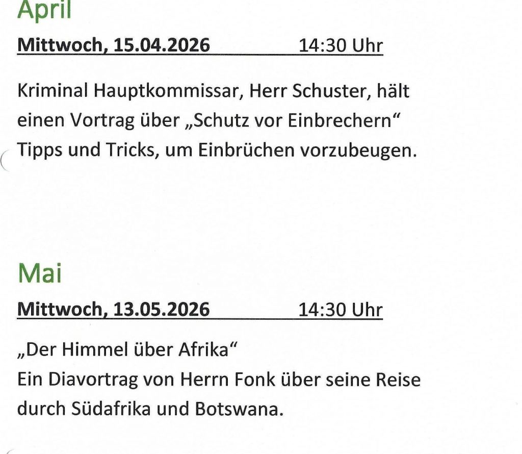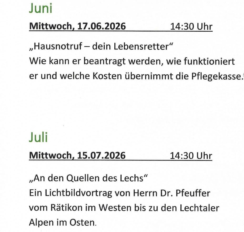Das Team St. Georg organisiert und hält einmal im Monat an einem Mittwoch den Seniorennachmittag ab 14:30 Uhr im Pfarrsaal St. Georg ab. Die Bandbreite der angebotenen Themen reicht von Religion, Gesundheit, Reisen, bis Sicherheit und Freizeit.